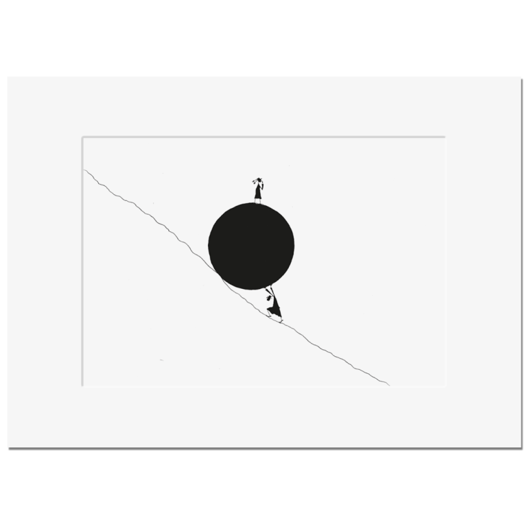 Die Motive für diese Serie zeichne ich mit Spitzfeder und Tusche auf speziellem Zeichenkarton. Dabei versuche ich, die Szene auf ein Minimum zu reduzieren und die Komik der Situation mit möglichst wenigen, klaren Strichen festzuhalten.
