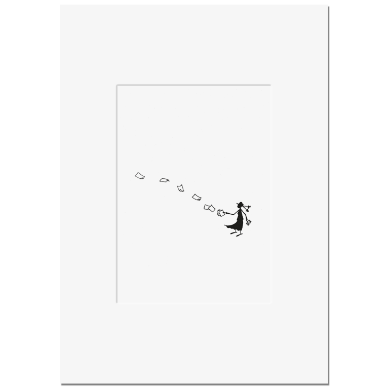 Die Motive für diese Serie zeichne ich mit Spitzfeder und Tusche auf speziellem Zeichenkarton. Dabei versuche ich, die Szene auf ein Minimum zu reduzieren und die Komik der Situation mit möglichst wenigen, klaren Strichen festzuhalten.