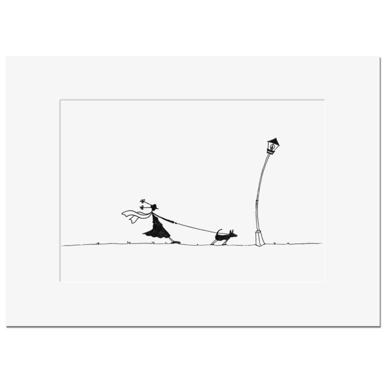 Die Motive für diese Serie zeichne ich mit Spitzfeder und Tusche auf speziellem Zeichenkarton. Dabei versuche ich, die Szene auf ein Minimum zu reduzieren und die Komik der Situation mit möglichst wenigen, klaren Strichen festzuhalten.