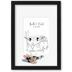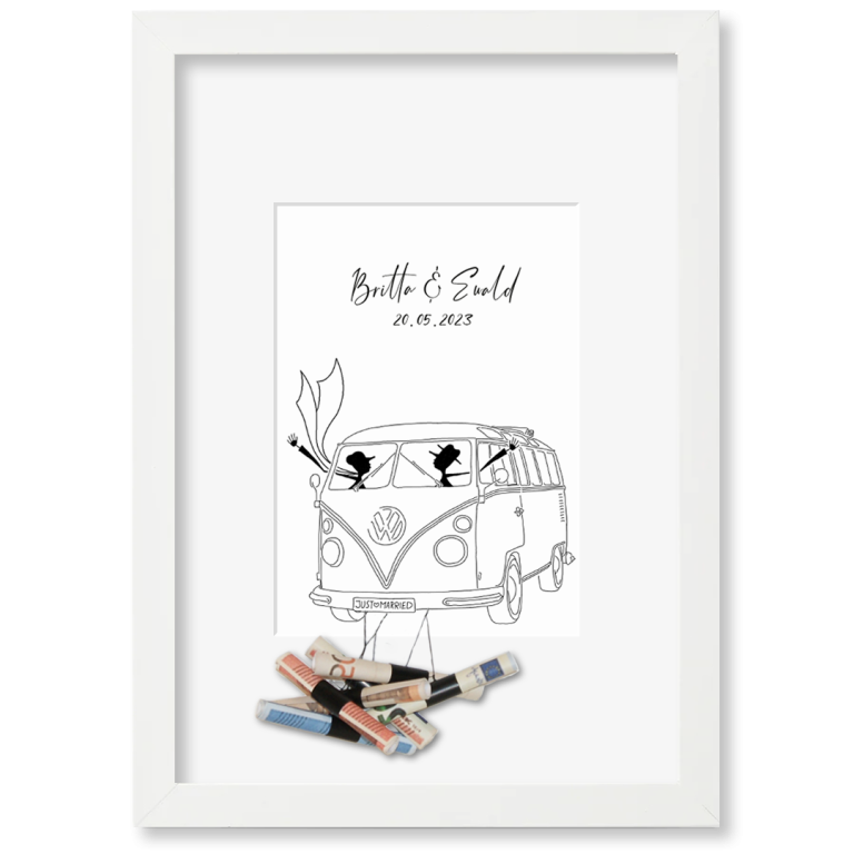 In die sechs kleinen schwarzen Röhrchen, die an Fäden in das Bild eingearbeitet sind, schiebst Du dünn zusammengerollt die einzelnen Geldscheine – und fertig ist Dein einzigartiges Geldgeschenk! Wird das Geld diesen Röhrchen entnommen, erinnern sie an Blechdosen, die den Ritt im “Just Married”-Bulli mit lautem Scheppern begleiten.