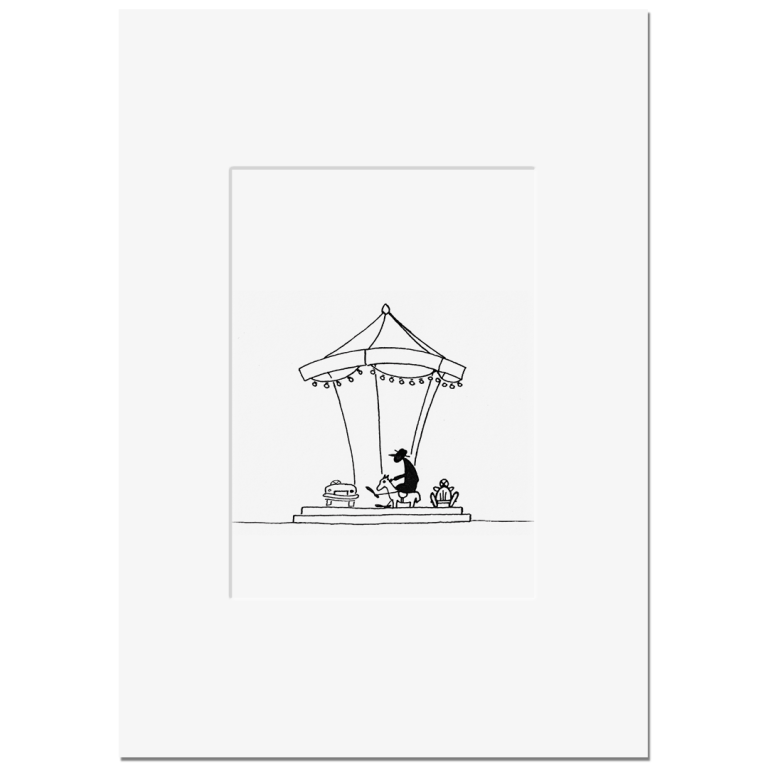 Die Motive für diese Serie zeichne ich mit Spitzfeder und Tusche auf speziellem Zeichenkarton. Dabei versuche ich, die Szene auf ein Minimum zu reduzieren und die Komik der Situation mit möglichst wenigen, klaren Strichen festzuhalten.