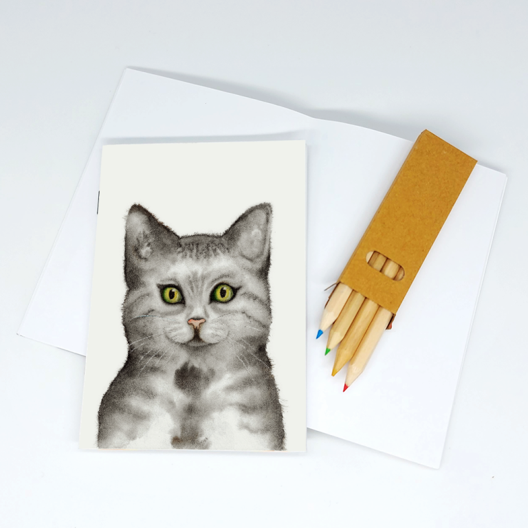 Diese kleinen Notiz-Heftchen wecken bei Deinen Kindern die Liebe zur Kunst! Auf dem Cover aus Aquarellkarton fordert eines meiner herzigen Tierkinder-Portraits mit seinem unwiderstehlichen Blick dazu auf, mit dem beigepackten Set aus 4 Mini-Buntstiften gleich erste Skizzen zu zeichnen!