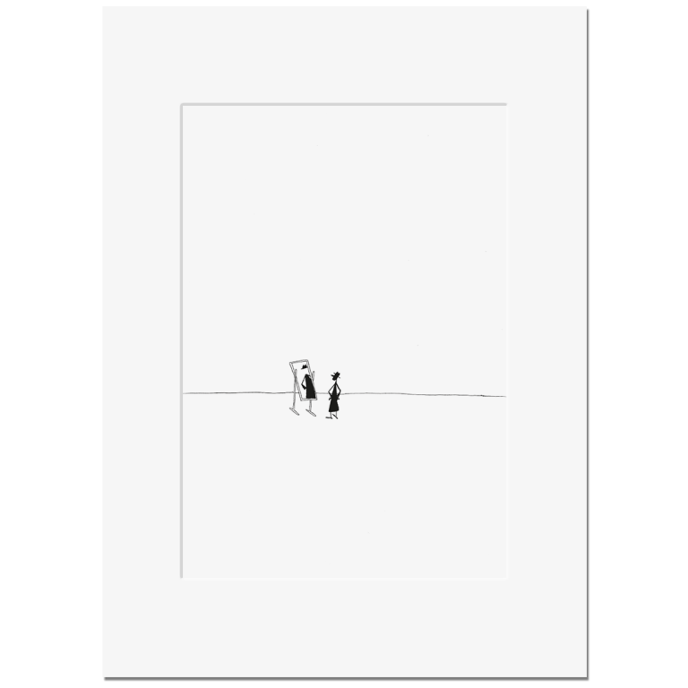 Die Motive für diese Serie zeichne ich mit Spitzfeder und Tusche auf speziellem Zeichenkarton. Dabei versuche ich, die Szene auf ein Minimum zu reduzieren und die Komik der Situation mit möglichst wenigen, klaren Strichen festzuhalten.