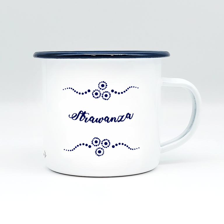 Emaillierte Blechtasse mit dunkelblauem Rollrand | Fassungsvermögen 330ml (12oz) | Handwäsche empfohlen – nicht spülmaschinenfest, nicht mikrowellengeeignet