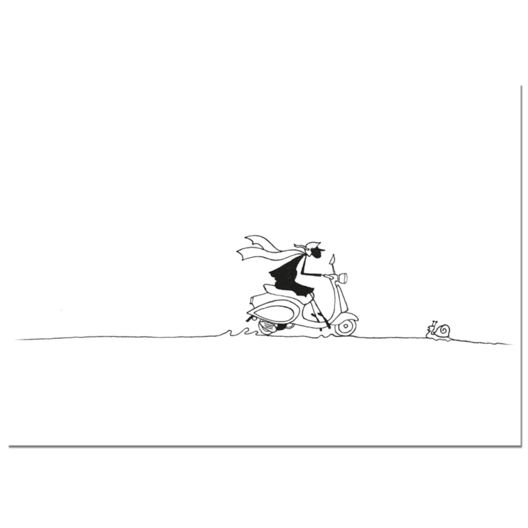 Die Motive für diese Serie zeichne ich mit Spitzfeder und Tusche auf speziellem Zeichenkarton. Dabei versuche ich, die Szene auf ein Minimum zu reduzieren und die Komik der Situation mit möglichst wenigen, klaren Strichen festzuhalten.